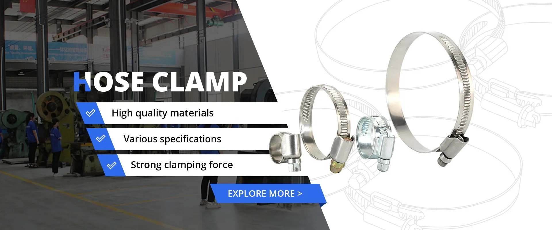 Productos principales:Abrazadera de manguera, Abrazadera de manguera americana, Abrazadera de manguera de tipo alemán, Abrazadera de manguera de doble alambre, Abrazadera de manguera de tipo europeo